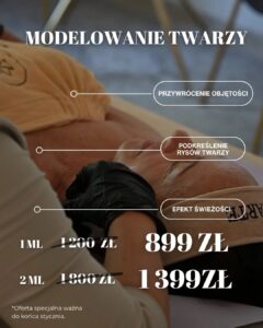 Jeśli marzysz o naturalnym efekcie liftingu i poprawie owalu twarzy, to idealny moment. Modelowanie twarzy: 1 ml – 899 zł zamiast 1200 zł | 2 ml – 1399 zł zamiast 1800 zł. Tylko do końca stycznia!
